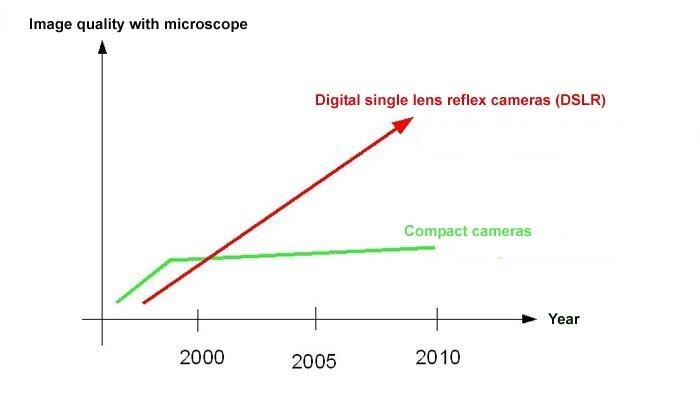 相機價格一直在下調(diào),尤其是卡片相機。那些新的高性能技術(shù)帶來的圖像質(zhì)量的提高大部分都是高端單反相機型號。新入門型號相機價格在300歐元或者使用2002年后的數(shù)碼單反相機也是十分適合用于顯微拍攝。
