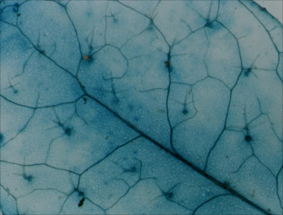 在體視顯微鏡下,染色后的甘薯切片,外觀像一片樹葉